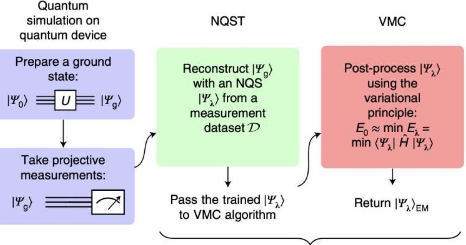 研究人员设计的新策略神经错误缓解 (NEM) 有两个关键组成部分或步骤。首先,该团队使用一种称为神经量子态断层扫描 (NQST) 的技术来训练所谓的 NQS ansalz 来表示由噪声量子设备制备的近似基态。