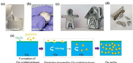 镓基液态金属内颗粒的混合会改变材料的物理性质,从而使处理起来更加容易。第一作者王春晖指出:“液态镓复合材料形成糊状或腻子的能力是非常有益的。它消除了应用中镓处理的大部分问题。它不再弄脏表面,可以将其涂或涂在表面上。几乎可以在任何表面上将其模制成各种形状。这为镓开辟了前所未有的多种应用。” 该发现的潜在应用包括需要柔软而灵活的电子设备的情况,例如在可穿戴设备和医疗植入物中。研究甚至表明,该复合材料可制成具有极高耐热性的多孔泡沫状材料,