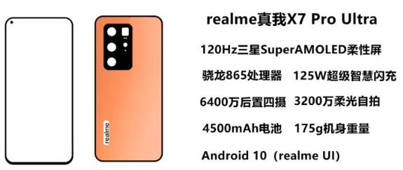 泄漏带有Realme X7 Pro Ultra的示意图。可以看出,手机具有打孔显示。泄漏表明手机配备了S-AMOLED显示屏,可产生120Hz的刷新率。作为高级设备,屏幕可能具有弯曲的边缘。