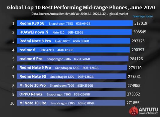 在6月份,Redmi K30 5G以317019分的高分成功保住了其作为性能最好的中档智能手机的榜首位置。该设备由一个八核Snapdragon 765G SoC以及6GB RAM和64GB板载存储支持。